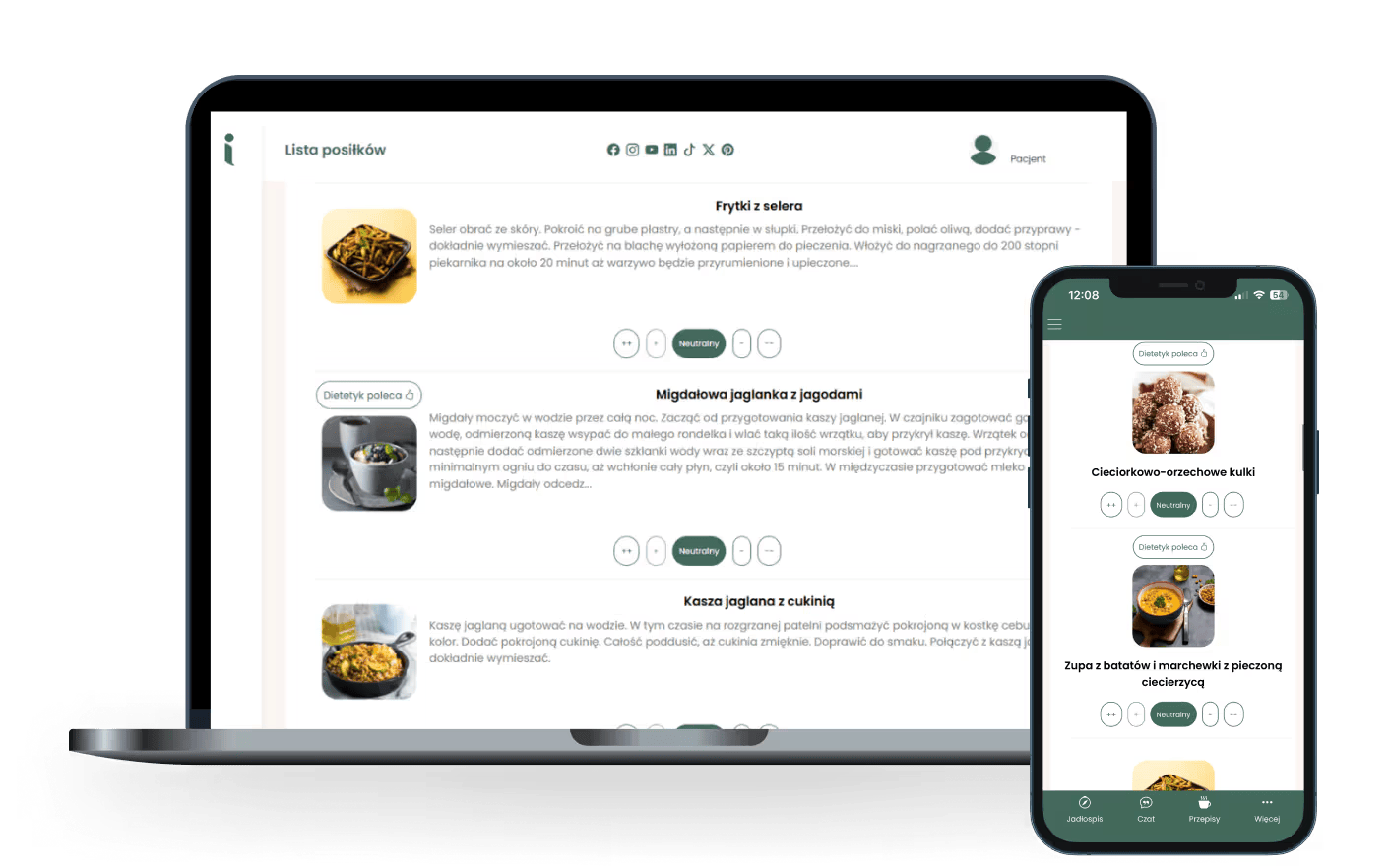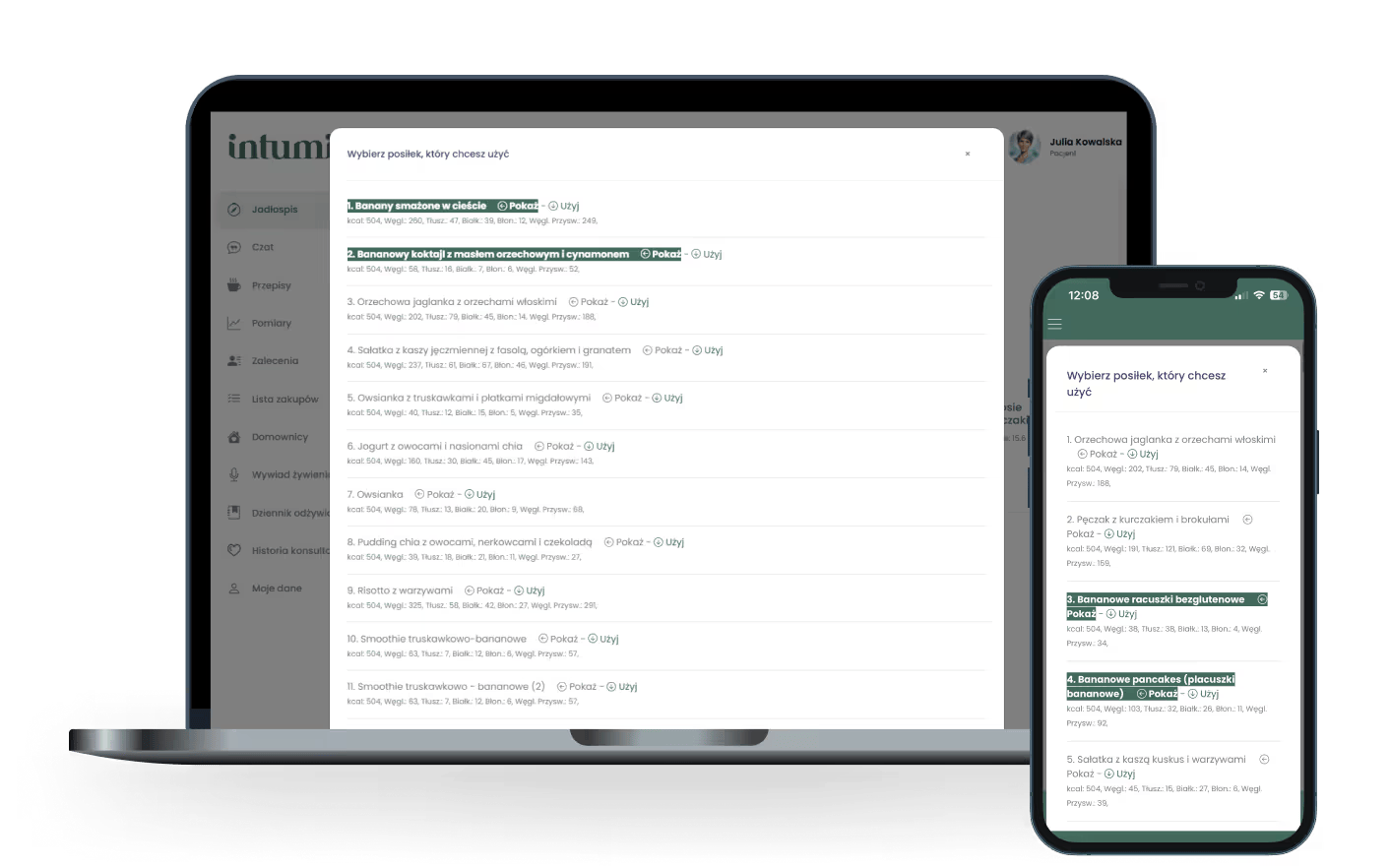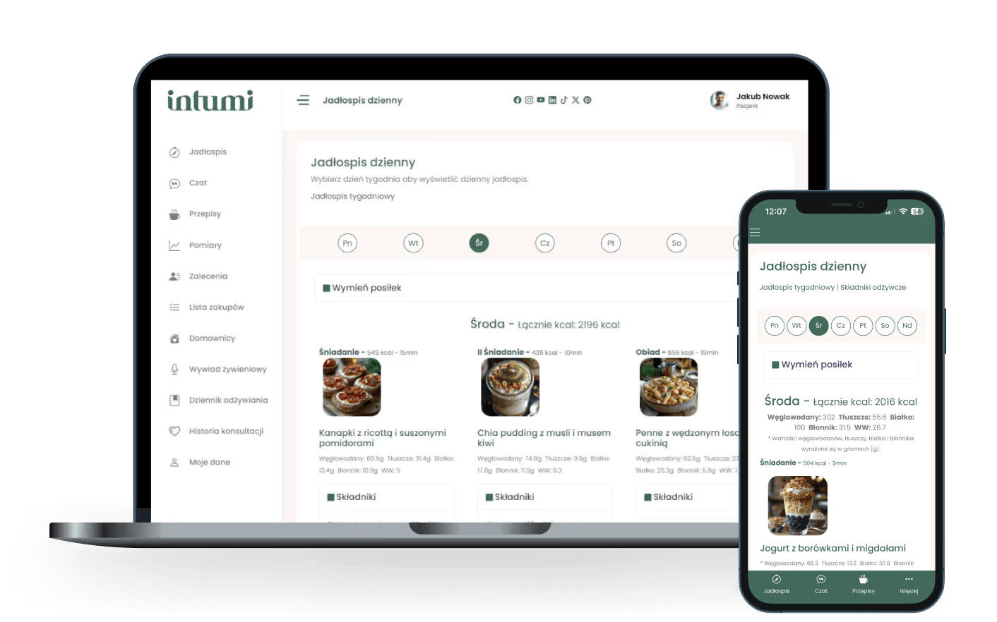 INTUMI stosuje algorytmy oparte na metodach numerycznych i optymalizacji stochastycznej, które analizują ogromne ilości danych dotyczących zdrowia, preferencji żywieniowych oraz historii medycznej użytkowników. Algorytmy te są w stanie zidentyfikować optymalne schematy żywieniowe, które najlepiej odpowiadają Twoim indywidualnym potrzebom. Dzięki zaawansowanym algorytmom posiłki są automatycznie dopasowywane do Twoich preferencji i potrzeb zdrowotnych, co oznacza, że każda propozycja będzie idealnie skomponowana dla Ciebie. System kontroluje wartości norm żywieniowych każdego posiłku, takich jak witaminy, minerały, makroskładniki, co daje Ci pewność, że Twoja dieta nie tylko spełnia Twoje oczekiwania smakowe, ale także jest optymalnie dostosowana do Twojego stanu zdrowia.