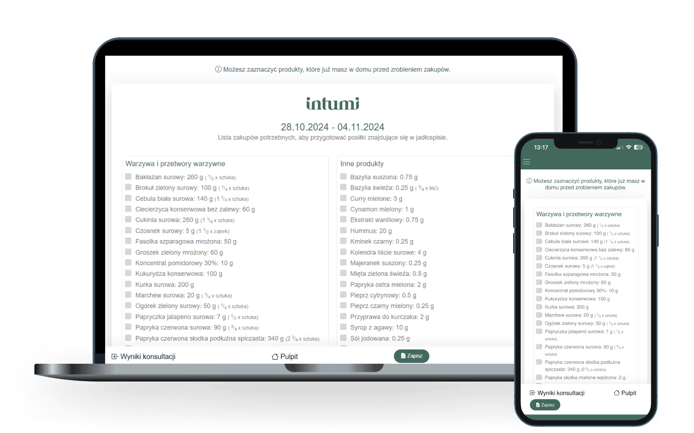 6. Technologia i narzędzia: Korzystaj z aplikacji do planowania posiłków i tworzenia list zakupów. Intumi oferuje takie narzędzia, które ułatwiają organizację i pomagają wprowadzić zdrowe nawyki do Twojego codziennego życia.