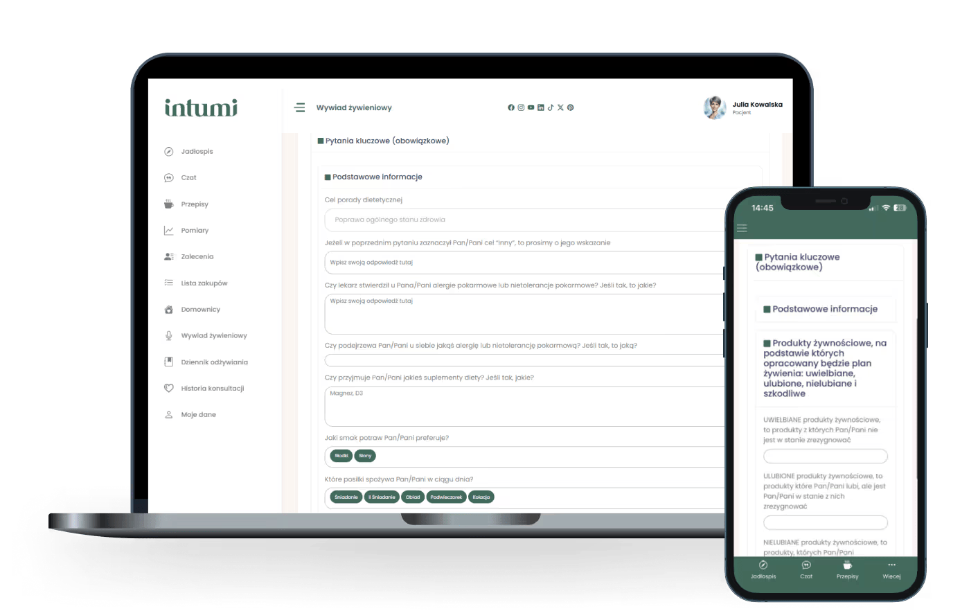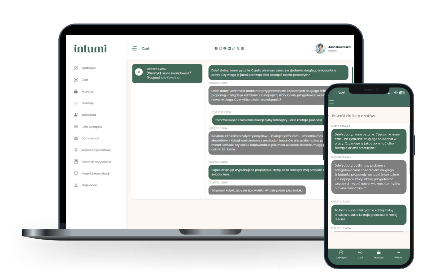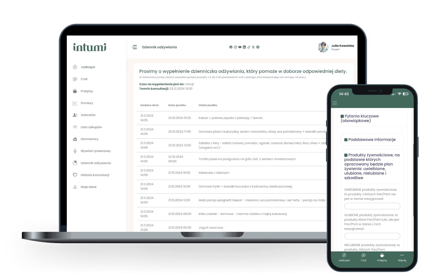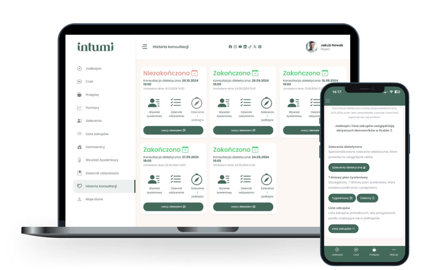 Twój spersonalizowany plan żywieniowy jest idealnie dopasowany do Twojego stylu życia, celów zdrowotnych i preferencji smakowych. Dzięki temu poczujesz, że wszystko jest dokładnie tak, jak powinno, a Twoje potrzeby są w centrum uwagi. System Intumi dostarcza rzetelnych, naukowo uzasadnionych planów dietetycznych, które eliminują chaos informacyjny i dają Ci pewność, że Twoja dieta opiera się na solidnych fundamentach. Dietetycy w Intumi pomagają przefiltrować nadmiar informacji, dostarczając tylko te, które są istotne i użyteczne dla Ciebie. To wsparcie sprawia, że czujesz się pewniej i bardziej skoncentrowany, wiedząc, że Twoje wybory żywieniowe są oparte na rzetelnych danych, co eliminuje zamieszanie i zwiększa Twoją pewność siebie.