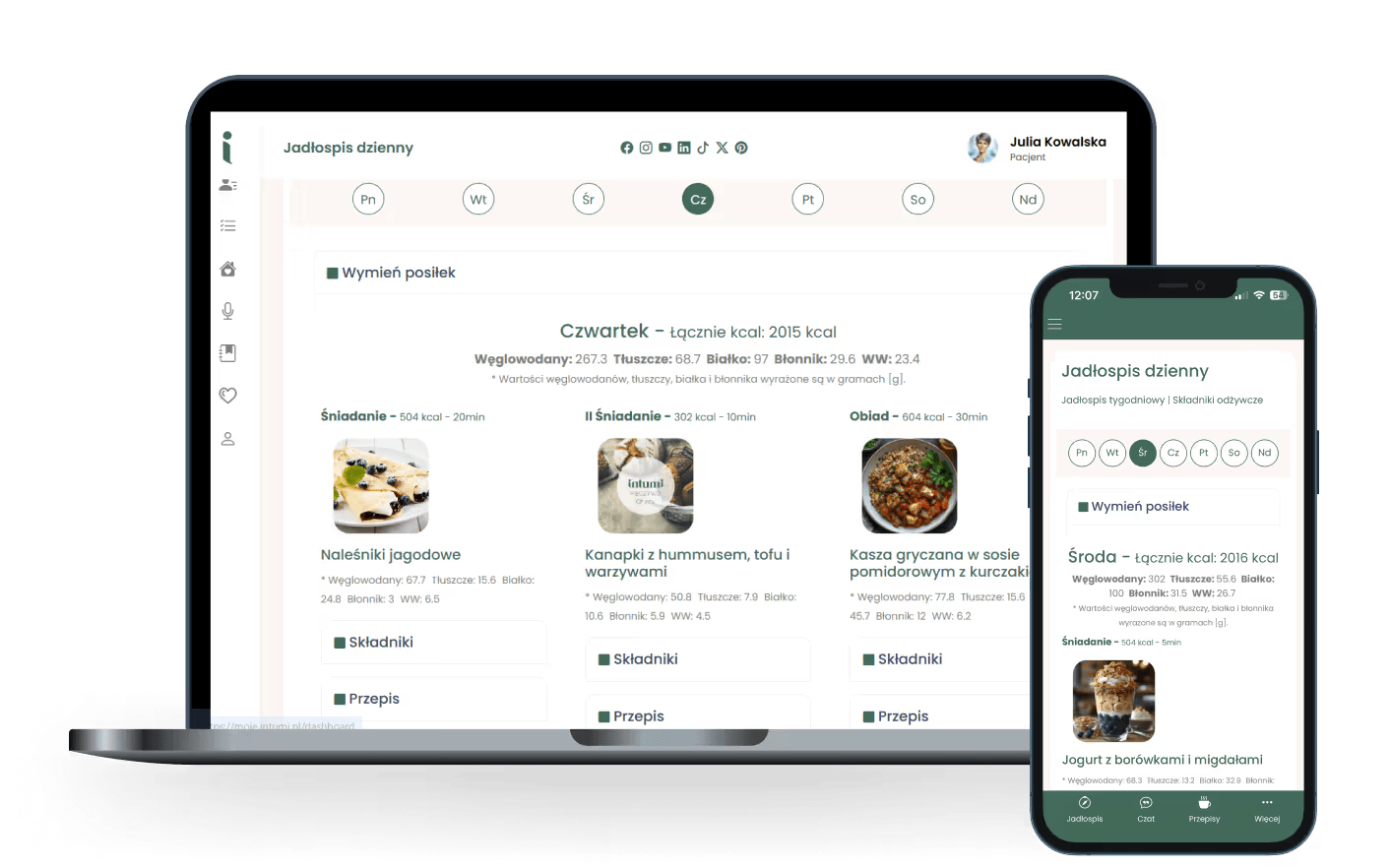 Skuteczność diety jest monitorowana regularnie poprzez konsultacje, podczas których analizowane są Twoje postępy. Jeśli zauważymy, że wyniki nie są zgodne z oczekiwaniami, możemy wprowadzić odpowiednie korekty. Dodatkowo, system Intumi wspiera Cię, dostarczając narzędzi do monitorowania stanu zdrowia i postępów, co pozwala na szybkie reagowanie na wszelkie odchylenia od planu.