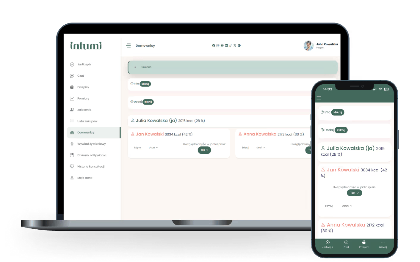 System Intumi oraz pracujący z nim dietetycy dbają o to, aby Twoja dieta była wolna od alergenów i produktów, które wywołują u Ciebie nietolerancje, co znacząco zwiększa Twoje poczucie bezpieczeństwa. Dzięki temu masz pewność, że Twoje posiłki są nie tylko zdrowe, ale również bezpieczne i w pełni dostosowane do Twoich potrzeb zdrowotnych. Dietetycy dokładnie oceniają Twoje potrzeby, aby zaproponować produkty, które minimalizują ryzyko niepożądanych reakcji alergicznych, jednocześnie dostarczając niezbędnych wartości odżywczych. To połączenie zaawansowanej technologii i eksperckiej wiedzy daje Ci poczucie spokoju i pewności, że Twoja dieta jest starannie dobrana i wspierana przez nowoczesne narzędzia.