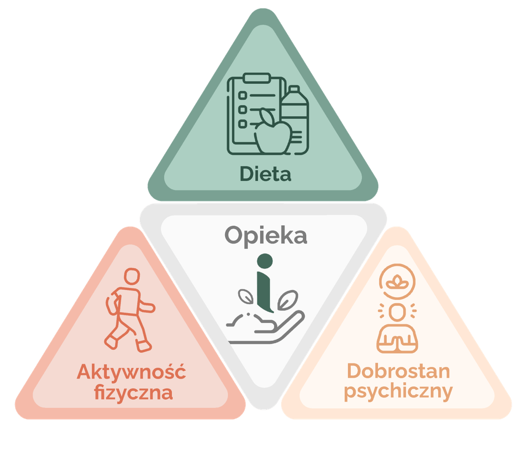 W środku tej piramidy leży nasza Opieka, która spaja wszystkie pozostałe aspekty, zapewniając wsparcie, troskę i indywidualne podejście na każdym etapie Twojej drogi do zdrowia.